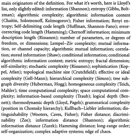 Information, when quantified, typically takes the form of a complexity measure. Seth Lloyd has catalogued numerous different types of complexity measures used by mathematicians, engineers, and scientists. Here are a few that he shared with John Horgan: