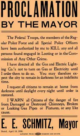 In 1906 a devastating earthquake hit San Francisco. The mayor at that time was one E.E. Schmitz. Mayor Schmitz issued the following proclamation: