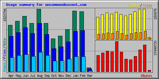 The sharp spike in hits and files (green and dark blue) are mostly due to the new layout. The key statistic is daily average number of visits. Total visits are shown in yellow but that varies by number of days in the month so the daily average is the better metric.