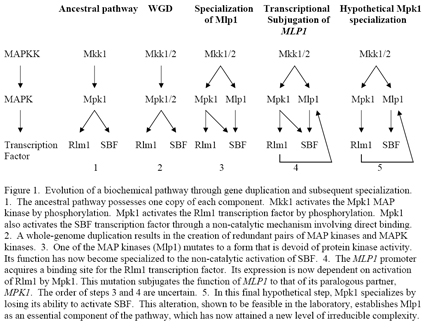 The Kellis et al. analysis of paralogous Saccharomyces genes and Kluyvermyces genes revealed that in many cases, one copy was evolutionarily restrained to carry out the ancestral function, whereas the other was free to diverge at an accelerated rate. Such is the case for the gene pair that is the subject of our example (outlined in Figure 1). These paralogous yeast genes, called MPK1 (for MAP Kinase 1) and MLP1 (for Mpk1-Like Protein), encode proteins whose functions are activated through a complex pathway of protein phosphorylation, known as a MAP kinase cascade. This cascade is activated in response to cell wall stress and is essential to the maintenance of cell wall integrity in fungal species. The Mpk1 protein retains two ancestral functions, one of which is protein kinase activity against targets that include a transcription factor called Rlm1. The second function of Mpk1 is highly atypical– it acts as a co-transcription factor (with another factor called SBF). Both of the Mpk1 functions require its activation by an upstream protein kinase (Mkk1/2), but its co-transcriptional function does not require its catalytic (protein kinase) activity.