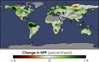 This map is the result of 8 scientists poring over satellite data for 18 months. It shows how plant growth (NPP or net primary productivity) around the world has changed in the past 20 years of global warming and CO2 buildup in the atmosphere. The result is a 6% increase when all the globe’s vegetation is tallied up and averaged. The research appeared in Science. The article I got the picture from is at NASA titled Global Garden.