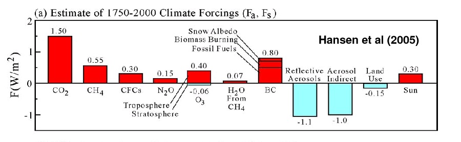 You’ll find all the forcing factors (Hansen et al vs. IPCC) agree except for black carbon. In Hansen black carbon (BC) is given a forcing factor of 0.8 (a major factor second only to C02) but in the IPCC report it’s given a factor of 0.1 which makes it trivial. Also note Hansen says BC is TWICE AS EFFECTIVE as a CO2 forcing of the same magnitude so we can double that 0.8 to 1.6 so black carbon alone should be equal to CO2 as a source of warming.
